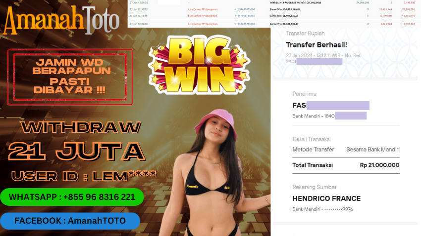 Amanahtoto – Adalah Agen judi online terpercaya dan pastinya gacor yang telah membuktikan kemenangan member lewat bukti jeckpot. Dengan bukti jeckpot setiap player dapat mengetahui bahwa situs Amanahtoto memiliki tingkat kualitas terbaik dari kemenangan di game dan dijamin aman terpercaya untuk player yang ingin mencoba merasakan kemenangan dalam permainan judi online di Indonesia.