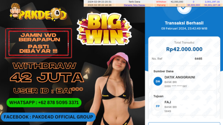 PAKDE4D – Situs Bandar Togel Online, Live Casino dan Slot Online Terpercaya yang terbukti membayar berapapun kemenangan Anda. Jika Anda masih mencari Situs Bandar Terpercaya, jangan ragu untuk bergabung bersama PAKDE4D. Dalam 1 akun Anda bisa menikmati semua permainan yang disediakan dengan minimal deposit hanya Rp. 10.000,- melalui transaksi Bank Lokal Indonesia dan Dompet Digital…