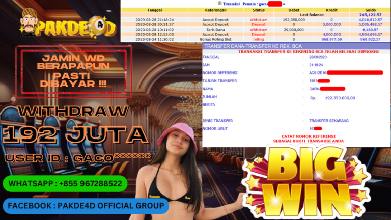 PAKDE4D JACKPOT DI PERMAINAN SLOT RP. 192.350.000 LUNAS