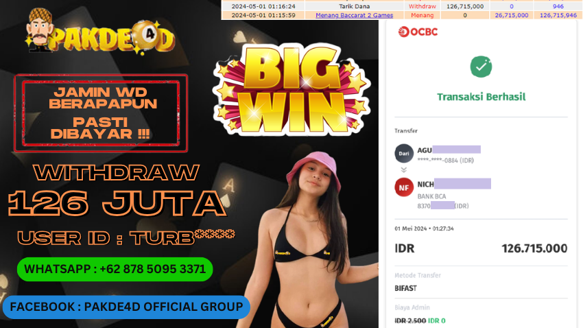Selamat Kepada Member Setia PAKDE4D dengan USER ID : TUR***** di PERMAINAN LIVE CASINO BACCARAT sebesar Rp. 126.715.000,- LUNAS langsung mendarat ke rekening tanpa bertele – tele. Terimakasih telah mempercayakan PAKDE4D sebagai Situs Bandar Terpercaya dan Terjamin Aman! Tunggu apalagi? Daftar sekarang juga bersama PAKDE4D dan dapatkan berbagai promo menarik setiap harinya.