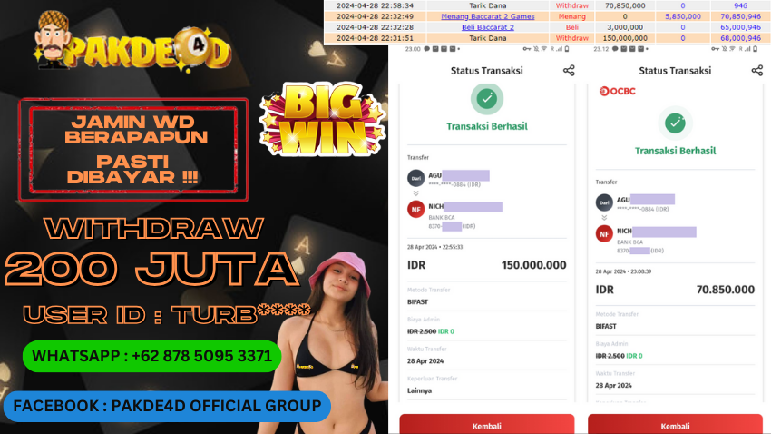 Selamat Kepada Member Setia PAKDE4D dengan USER ID : TUR***** di PERMAINAN LIVE CASINO BACCARAT sebesar Rp. 200.000.000,- LUNAS langsung mendarat ke rekening tanpa bertele – tele. Terimakasih telah mempercayakan PAKDE4D sebagai Situs Bandar Terpercaya dan Terjamin Aman! Tunggu apalagi? Daftar sekarang juga bersama PAKDE4D dan dapatkan berbagai promo menarik setiap harinya.