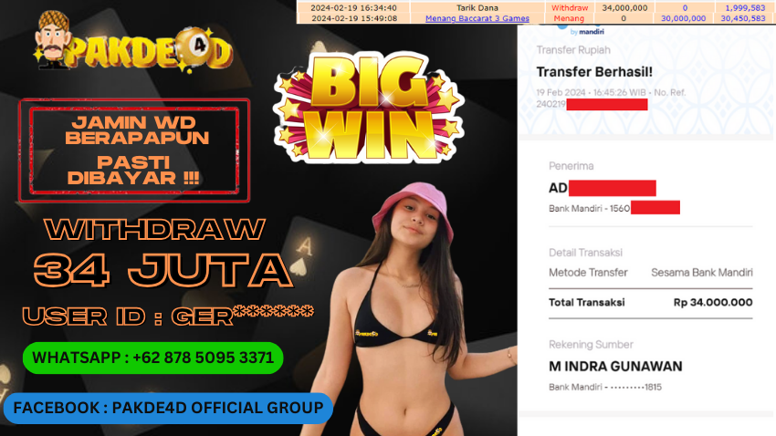 Selamat Kepada Member Setia PAKDE4D dengan USER ID : GER****** di PERMAINAN LIVE CASINO BACCARAT sebesar Rp. 34.000.000,- LUNAS langsung mendarat ke rekening tanpa bertele – tele. Terimakasih telah mempercayakan PAKDE4D sebagai Situs Bandar Terpercaya dan Terjamin Aman! Tunggu apalagi? Daftar sekarang juga bersama PAKDE4D dan dapatkan berbagai promo menarik setiap harinya.