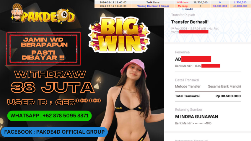 Selamat Kepada Member Setia PAKDE4D dengan USER ID : GER****** di PERMAINAN LIVE CASINO BACCARAT sebesar Rp. 38.500.000,- LUNAS langsung mendarat ke rekening tanpa bertele – tele. Terimakasih telah mempercayakan PAKDE4D sebagai Situs Bandar Terpercaya dan Terjamin Aman! Tunggu apalagi? Daftar sekarang juga bersama PAKDE4D dan dapatkan berbagai promo menarik setiap harinya.