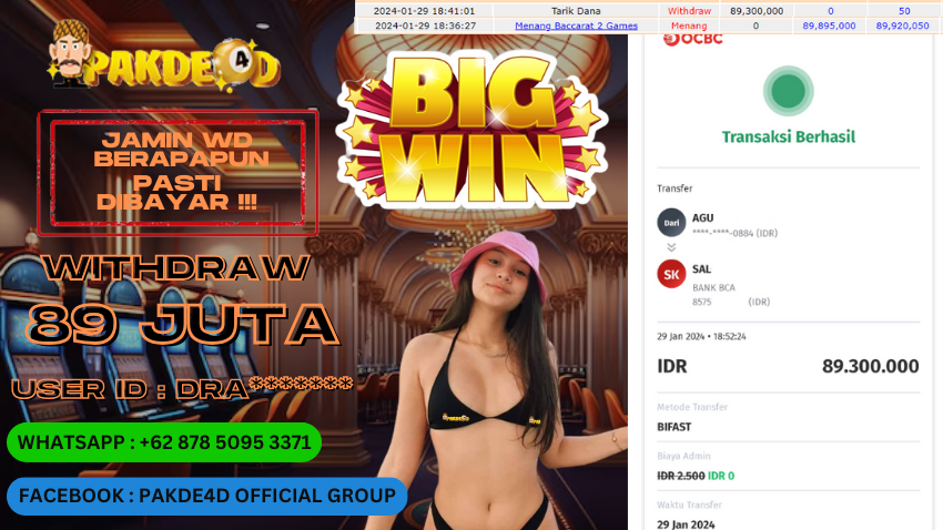 Selamat Kepada Member Setia PAKDE4D dengan USER ID : DRA******* di PERMAINAN LIVE CASINO BACCARAT sebesar Rp. 89.300.000,- LUNAS langsung mendarat ke rekening tanpa bertele – tele. Terimakasih telah mempercayakan PAKDE4D sebagai Situs Bandar Terpercaya dan Terjamin Aman! Tunggu apalagi? Daftar sekarang juga bersama PAKDE4D dan dapatkan berbagai promo menarik setiap harinya.