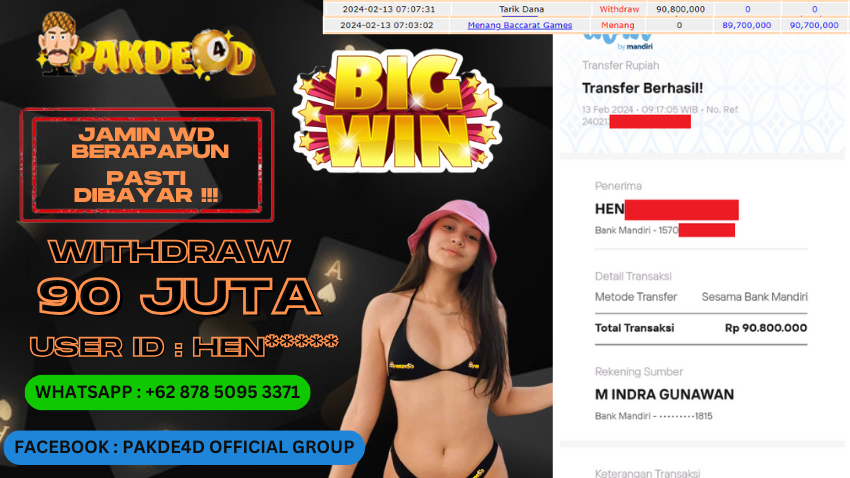 Selamat Kepada Member Setia PAKDE4D dengan USER ID : HEN***** di PERMAINAN LIVE CASINO BACCARAT sebesar Rp. 90.800.000,- LUNAS langsung mendarat ke rekening tanpa bertele – tele. Terimakasih telah mempercayakan PAKDE4D sebagai Situs Bandar Terpercaya dan Terjamin Aman! Tunggu apalagi? Daftar sekarang juga bersama PAKDE4D dan dapatkan berbagai promo menarik setiap harinya.