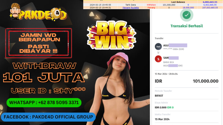 Selamat Kepada Member Setia PAKDE4D dengan USER ID : SHY*** di PERMAINAN LIVE CASINO ROULETTE sebesar Rp. 101.000.000,- LUNAS langsung mendarat ke rekening tanpa bertele – tele. Terimakasih telah mempercayakan PAKDE4D sebagai Situs Bandar Terpercaya dan Terjamin Aman! Tunggu apalagi? Daftar sekarang juga bersama PAKDE4D dan dapatkan berbagai promo menarik setiap harinya.