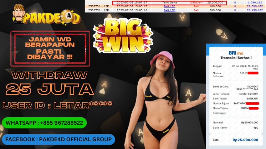 Selamat Kepada Member Setia PAKDE4D dengan USER ID : LETAR***** di PERMAINAN LIVE CASINO sebesar Rp. 25.000.000,- LUNAS langsung mendarat ke rekening tanpa bertele – tele. Terimakasih telah mempercayakan PAKDE4D sebagai Situs Bandar Terpercaya dan Terjamin Aman! Tunggu apalagi? Daftar sekarang juga bersama PAKDE4D dan dapatkan berbagai promo menarik setiap harinya.