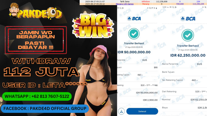PAKDE4D – Situs Bandar Togel Online, Live Casino dan Slot Online Terpercaya yang terbukti membayar berapapun kemenangan Anda. Jika Anda masih mencari Situs Bandar Terpercaya,   jangan ragu untuk bergabung bersama PAKDE4D. Dalam 1 akun Anda bisa menikmati semua permainan yang disediakan dengan minimal deposit hanya Rp. 10.000,-  melalui transaksi Bank Lokal Indonesia dan Dompet Digital yang online 24 jam. Berbagai pasaran togel online resmi bisa Anda nikmati di PAKDE4D, mulai dari Togel Hongkong, Togel Sydney, Togel Singapore, Totomacau dan Togel WLA terbaik lainnya. Anda juga bisa menikmati permainan Live Casino lengkap dan Slot Online Gacor terbaik.  Hadiah dan Diskon yang disediakan juga sangat besar sehingga Anda bisa mendapatkan keuntungan berkali lipat bersama PAKDE4D. Berikut ini adalah BUKTI JACKPOT PAKDE4D yang sudah diproseskan langsung ke rekening member kami Selamat Kepada Member Setia PAKDE4D dengan USER ID : LETA****** di PERMAINAN LIVE GAME 12DSPIN sebesar Rp. 112.250.000,- LUNAS langsung mendarat ke rekening tanpa bertele – tele. Terimakasih telah mempercayakan PAKDE4D sebagai Situs Bandar Terpercaya dan Terjamin Aman! Tunggu apalagi? Daftar sekarang juga bersama PAKDE4D dan dapatkan berbagai promo menarik setiap harinya. 〽️BONUS CASHBACK 10% 〽️BONUS CASHBACK LIVE CASINO 10% 〽️BONUS ROLLINGAN SLOT GAMES 1%  〽️BONUS REFERRAL 1% Untuk mempermudah akses Anda, PAKDE4D menyediakan Link Alternatif dibawah ini apabila Anda mengalami kesulitan : ✅ https://heylink.me/pakde4d/ ✅ https://heylink.me/pakdetoto/ ✅ https://heylink.me/pakdetogel/ DOWNLOAD APLIKASI PAKDE4D : https://shorturl.at/gvwLN Cus tunggu apalagi GABUNG bersama PAKDE4D dan dapatkan kemenangan anda, tanpa ragu dan di jamin BUKAN SITUS KALENG-KALENG Boskuh , JP BERAPAPUN PASTI DI BAYAR DI PAKDE4D.