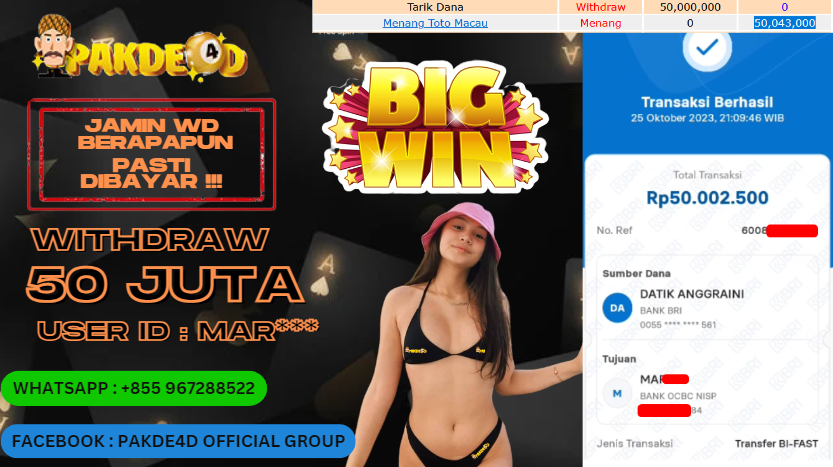 Selamat Kepada Member Setia PAKDE4D dengan USER ID : MAR*** di PERMAINAN TOGEL TTM 4D sebesar Rp. 50.000.000,- LUNAS langsung mendarat ke rekening tanpa bertele – tele. Terimakasih telah mempercayakan PAKDE4D sebagai Situs Bandar Terpercaya dan Terjamin Aman! Tunggu apalagi? Daftar sekarang juga bersama PAKDE4D dan dapatkan berbagai promo menarik setiap harinya.