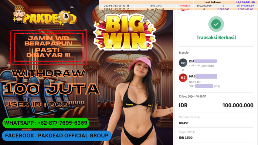 Selamat Kepada Member Setia PAKDE4D dengan USER ID : DOD**** di PERMAINAN SLOT sebesar Rp. 100.000.000,- LUNAS langsung mendarat ke rekening tanpa bertele – tele. Terimakasih telah mempercayakan PAKDE4D sebagai Situs Bandar Terpercaya dan Terjamin Aman! Tunggu apalagi? Daftar sekarang juga bersama PAKDE4D dan dapatkan berbagai promo menarik setiap harinya.