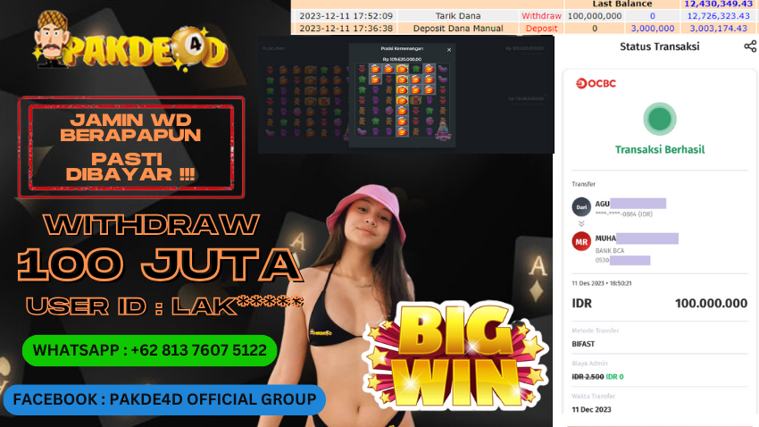 Selamat Kepada Member Setia PAKDE4D dengan USER ID : LAK***** di PERMAINAN SLOT sebesar Rp. 100.000.000,- LUNAS langsung mendarat ke rekening tanpa bertele – tele. Terimakasih telah mempercayakan PAKDE4D sebagai Situs Bandar Terpercaya dan Terjamin Aman! Tunggu apalagi? Daftar sekarang juga bersama PAKDE4D dan dapatkan berbagai promo menarik setiap harinya.