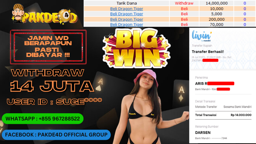 Selamat Kepada Member Setia PAKDE4D dengan USER ID : SUGE***** di PERMAINAN SLOT sebesar Rp. 14.000.000,- LUNAS langsung mendarat ke rekening tanpa bertele – tele. Terimakasih telah mempercayakan PAKDE4D sebagai Situs Bandar Terpercaya dan Terjamin Aman! Tunggu apalagi? Daftar sekarang juga bersama PAKDE4D dan dapatkan berbagai promo menarik setiap harinya.