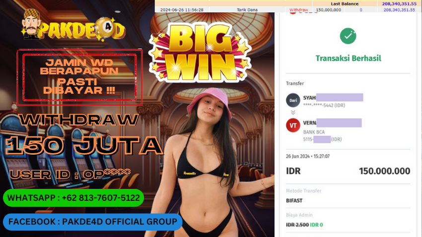 Selamat Kepada Member Setia PAKDE4D dengan USER ID : OP**** di PERMAINAN SLOT sebesar Rp. 150.000.000,- LUNAS langsung mendarat ke rekening tanpa bertele – tele. Terimakasih telah mempercayakan PAKDE4D sebagai Situs Bandar Terpercaya dan Terjamin Aman! Tunggu apalagi? Daftar sekarang juga bersama PAKDE4D dan dapatkan berbagai promo menarik setiap harinya.