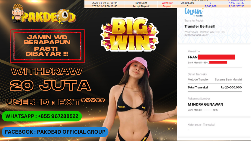 Selamat Kepada Member Setia PAKDE4D dengan USER ID : FXT******* di PERMAINAN SLOT sebesar Rp. 20.000.000,- LUNAS langsung mendarat ke rekening tanpa bertele – tele. Terimakasih telah mempercayakan PAKDE4D sebagai Situs Bandar Terpercaya dan Terjamin Aman! Tunggu apalagi? Daftar sekarang juga bersama PAKDE4D dan dapatkan berbagai promo menarik setiap harinya.