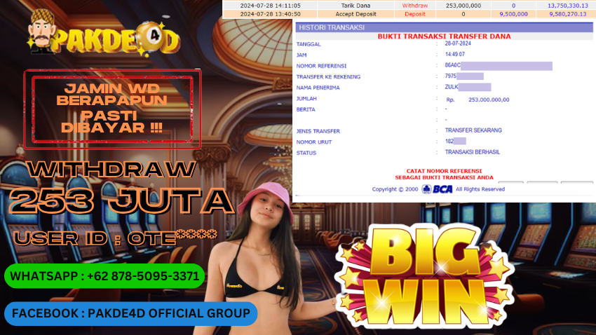 Selamat Kepada Member Setia PAKDE4D dengan USER ID : OTE**** di PERMAINAN SLOT sebesar Rp. 253.000.000,- LUNAS langsung mendarat ke rekening tanpa bertele – tele. Terimakasih telah mempercayakan PAKDE4D sebagai Situs Bandar Terpercaya dan Terjamin Aman! Tunggu apalagi? Daftar sekarang juga bersama PAKDE4D dan dapatkan berbagai promo menarik setiap harinya.