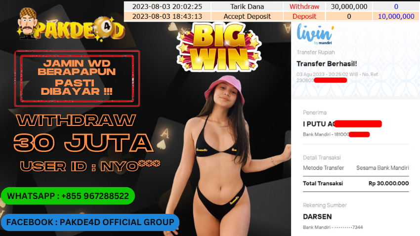 Selamat Kepada Member Setia PAKDE4D dengan USER ID : NYO*** di PERMAINAN SLOT sebesar Rp. 30.000.000,- LUNAS langsung mendarat ke rekening tanpa bertele – tele. Terimakasih telah mempercayakan PAKDE4D sebagai Situs Bandar Terpercaya dan Terjamin Aman! Tunggu apalagi? Daftar sekarang juga bersama PAKDE4D dan dapatkan berbagai promo menarik setiap harinya.