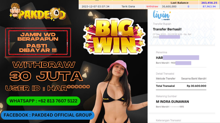 Selamat Kepada Member Setia PAKDE4D dengan USER ID : HAR****** di PERMAINAN SLOT sebesar Rp. 30.600.000,- LUNAS langsung mendarat ke rekening tanpa bertele – tele. Terimakasih telah mempercayakan PAKDE4D sebagai Situs Bandar Terpercaya dan Terjamin Aman! Tunggu apalagi? Daftar sekarang juga bersama PAKDE4D dan dapatkan berbagai promo menarik setiap harinya.