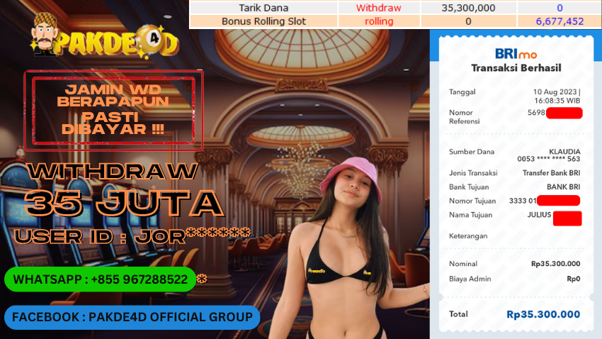 Selamat Kepada Member Setia PAKDE4D dengan USER ID : jor*** di PERMAINAN SLOT sebesar Rp. 35.300.000,- LUNAS langsung mendarat ke rekening tanpa bertele – tele. Terimakasih telah mempercayakan PAKDE4D sebagai Situs Bandar Terpercaya dan Terjamin Aman! Tunggu apalagi? Daftar sekarang juga bersama PAKDE4D dan dapatkan berbagai promo menarik setiap harinya.
