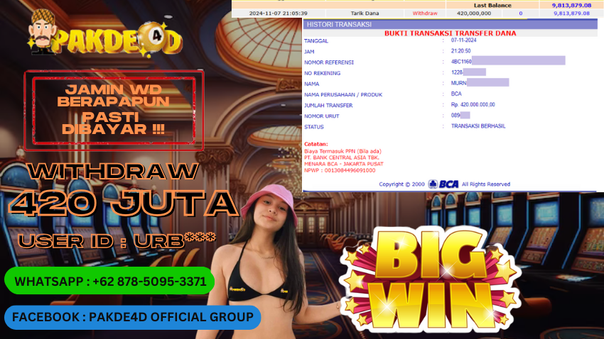 Selamat Kepada Member Setia PAKDE4D dengan USER ID : URB*** di PERMAINAN SLOT sebesar Rp. 420.000.000,- LUNAS langsung mendarat ke rekening tanpa bertele – tele. Terimakasih telah mempercayakan PAKDE4D sebagai Situs Bandar Terpercaya dan Terjamin Aman! Tunggu apalagi? Daftar sekarang juga bersama PAKDE4D dan dapatkan berbagai promo menarik setiap harinya.