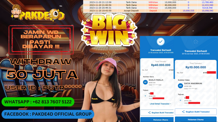 Selamat Kepada Member Setia PAKDE4D dengan USER ID : PUTR******* di PERMAINAN SLOT sebesar Rp. 50.000.000,- LUNAS langsung mendarat ke rekening tanpa bertele – tele. Terimakasih telah mempercayakan PAKDE4D sebagai Situs Bandar Terpercaya dan Terjamin Aman! Tunggu apalagi? Daftar sekarang juga bersama PAKDE4D dan dapatkan berbagai promo menarik setiap harinya.