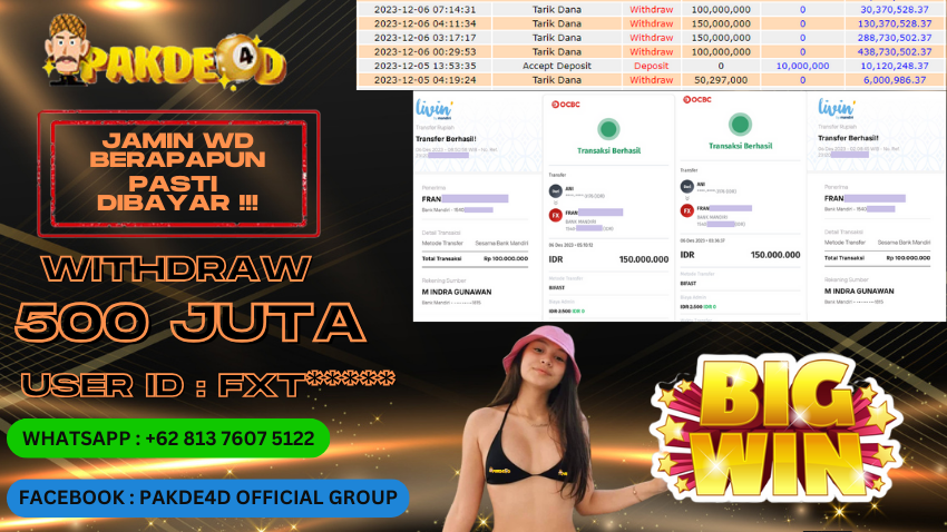 Selamat Kepada Member Setia PAKDE4D dengan USER ID : FXT******* di PERMAINAN SLOT sebesar Rp. 500.000.000,- LUNAS langsung mendarat ke rekening tanpa bertele – tele. Terimakasih telah mempercayakan PAKDE4D sebagai Situs Bandar Terpercaya dan Terjamin Aman! Tunggu apalagi? Daftar sekarang juga bersama PAKDE4D dan dapatkan berbagai promo menarik setiap harinya.