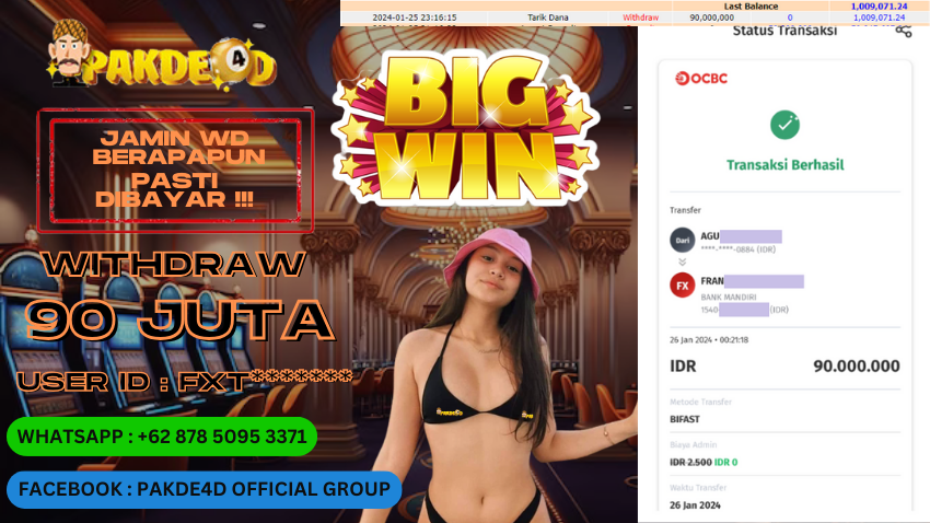 Selamat Kepada Member Setia PAKDE4D dengan USER ID : FXT******* di PERMAINAN SLOT sebesar Rp. 90.000.000,- LUNAS langsung mendarat ke rekening tanpa bertele – tele. Terimakasih telah mempercayakan PAKDE4D sebagai Situs Bandar Terpercaya dan Terjamin Aman! Tunggu apalagi? Daftar sekarang juga bersama PAKDE4D dan dapatkan berbagai promo menarik setiap harinya.