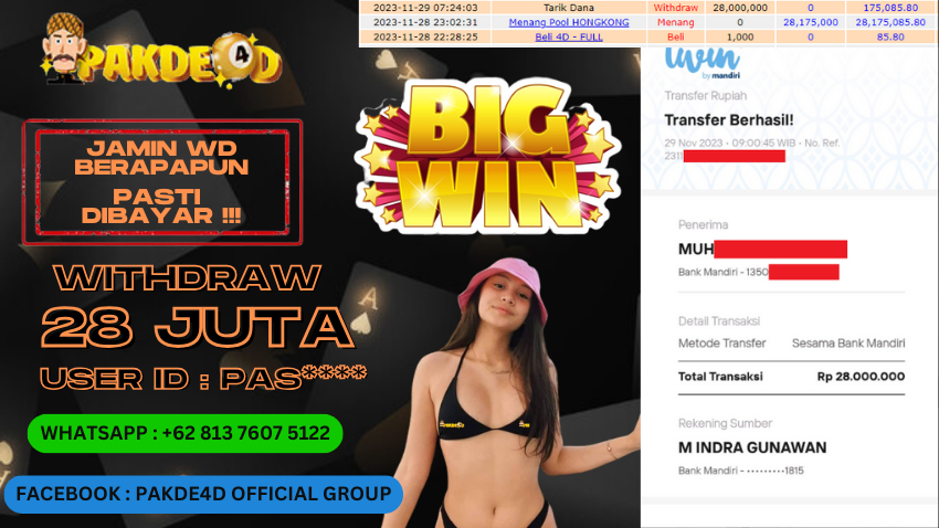 Selamat Kepada Member Setia PAKDE4D dengan USER ID : PAS**** di PERMAINAN TOGEL PASARAN HONGKONG POOLS RP. 28.000.000,- LUNAS langsung mendarat ke rekening tanpa bertele – tele. Terimakasih telah mempercayakan PAKDE4D sebagai Situs Bandar Terpercaya dan Terjamin Aman! Tunggu apalagi? Daftar sekarang juga bersama PAKDE4D dan dapatkan berbagai promo menarik setiap harinya.