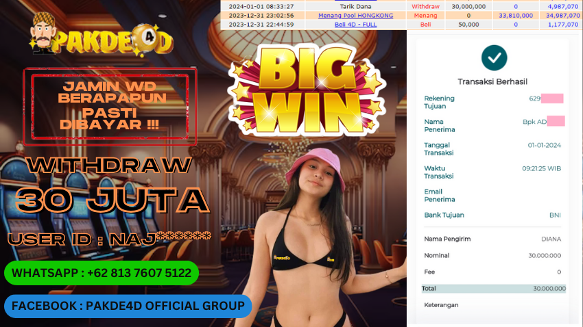 Selamat Kepada Member Setia PAKDE4D dengan USER ID : NAJ****** di PERMAINAN TOGEL PASARAN HONGKONG POOLS RP. 30.000.000,- LUNAS langsung mendarat ke rekening tanpa bertele – tele. Terimakasih telah mempercayakan PAKDE4D sebagai Situs Bandar Terpercaya dan Terjamin Aman! Tunggu apalagi? Daftar sekarang juga bersama PAKDE4D dan dapatkan berbagai promo menarik setiap harinya.