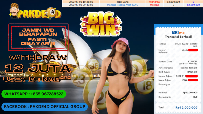 Selamat Kepada Member Setia PAKDE4D dengan USER ID : NAB*** di PERMAINAN TOGEL PASARAN NEWYORKEVE sebesar Rp. 20.000.000,- LUNAS langsung mendarat ke rekening tanpa bertele – tele. Terimakasih telah mempercayakan PAKDE4D sebagai Situs Bandar Terpercaya dan Terjamin Aman! Tunggu apalagi? Daftar sekarang juga bersama PAKDE4D dan dapatkan berbagai promo menarik setiap harinya.