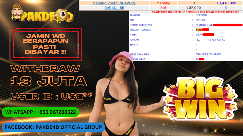 Selamat Kepada Member Setia PAKDE4D dengan USER ID : USE*** di PERMAINAN TOGEL PASARAN SINGAPORE sebesar Rp. 13.000.000,- LUNAS langsung mendarat ke rekening tanpa bertele – tele. Terimakasih telah mempercayakan PAKDE4D sebagai Situs Bandar Terpercaya dan Terjamin Aman! Tunggu apalagi? Daftar sekarang juga bersama PAKDE4D dan dapatkan berbagai promo menarik setiap harinya.