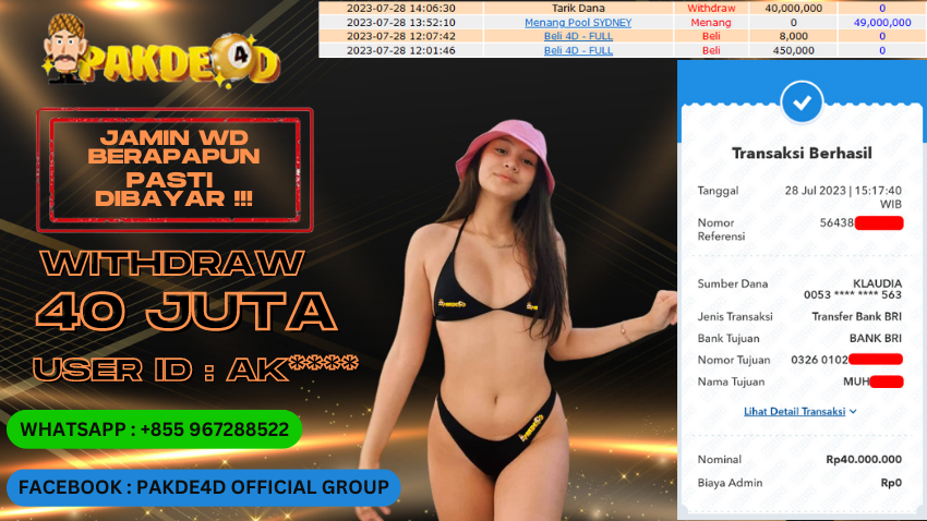Selamat Kepada Member Setia PAKDE4D dengan USER ID : AK**** di PERMAINAN TOGEL PASARAN SYDNEY sebesar Rp. 40.000.000,- LUNAS langsung mendarat ke rekening tanpa bertele – tele. Terimakasih telah mempercayakan PAKDE4D sebagai Situs Bandar Terpercaya dan Terjamin Aman! Tunggu apalagi? Daftar sekarang juga bersama PAKDE4D dan dapatkan berbagai promo menarik setiap harinya.