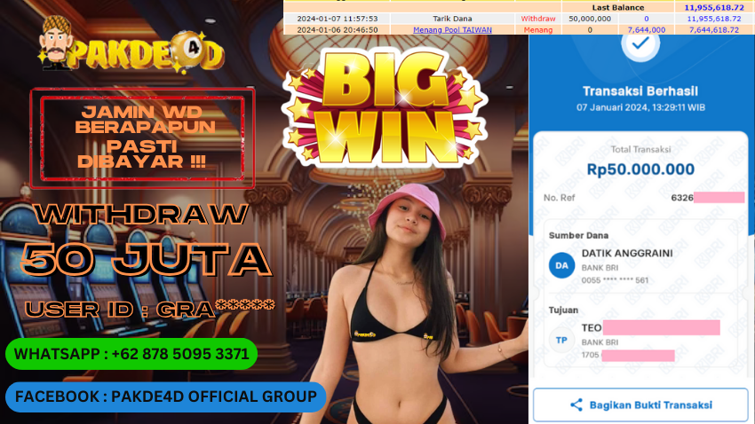 Selamat Kepada Member Setia PAKDE4D dengan USER ID : GRA***** di PERMAINAN TOGEL PASARAN TAIWAN POOLS & SLOT RP. 50.000.000,- LUNAS langsung mendarat ke rekening tanpa bertele – tele. Terimakasih telah mempercayakan PAKDE4D sebagai Situs Bandar Terpercaya dan Terjamin Aman! Tunggu apalagi? Daftar sekarang juga bersama PAKDE4D dan dapatkan berbagai promo menarik setiap harinya.