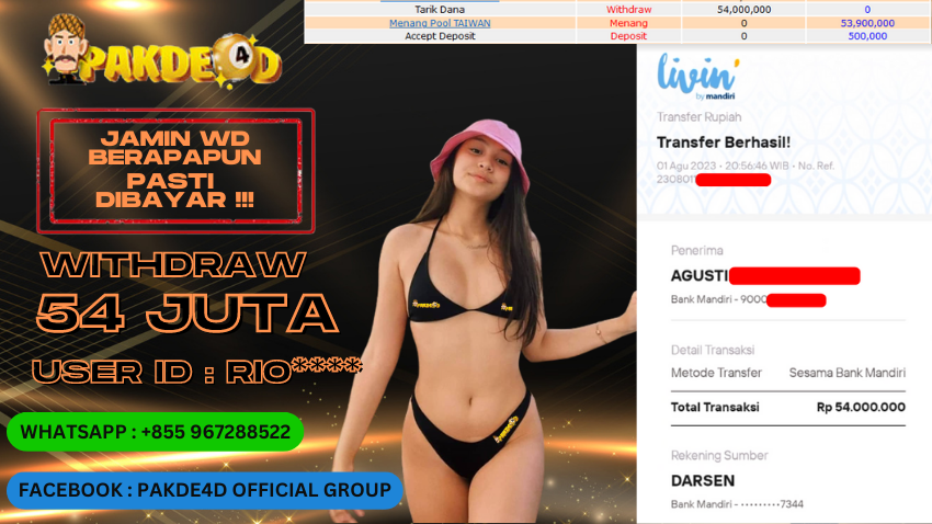 Selamat Kepada Member Setia PAKDE4D dengan USER ID : rio***** di PERMAINAN TOGEL PASARAN TAIWAN sebesar Rp. 54.000.000,- LUNAS langsung mendarat ke rekening tanpa bertele – tele. Terimakasih telah mempercayakan PAKDE4D sebagai Situs Bandar Terpercaya dan Terjamin Aman! Tunggu apalagi? Daftar sekarang juga bersama PAKDE4D dan dapatkan berbagai promo menarik setiap harinya.
