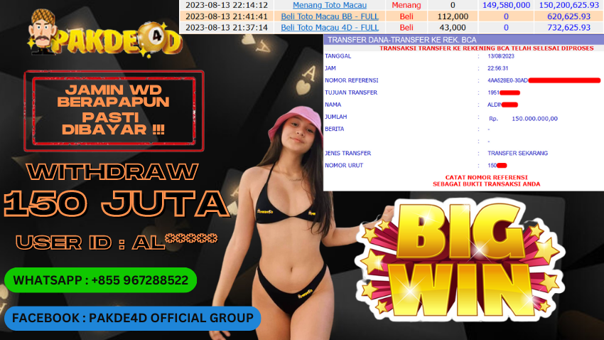 Selamat Kepada Member Setia PAKDE4D dengan USER ID : AL*** di PERMAINAN TOGEL PASARAN TOTOMACAU 4D sebesar Rp. 150.000.000,- LUNAS langsung mendarat ke rekening tanpa bertele – tele. Terimakasih telah mempercayakan PAKDE4D sebagai Situs Bandar Terpercaya dan Terjamin Aman! Tunggu apalagi? Daftar sekarang juga bersama PAKDE4D dan dapatkan berbagai promo menarik setiap harinya.